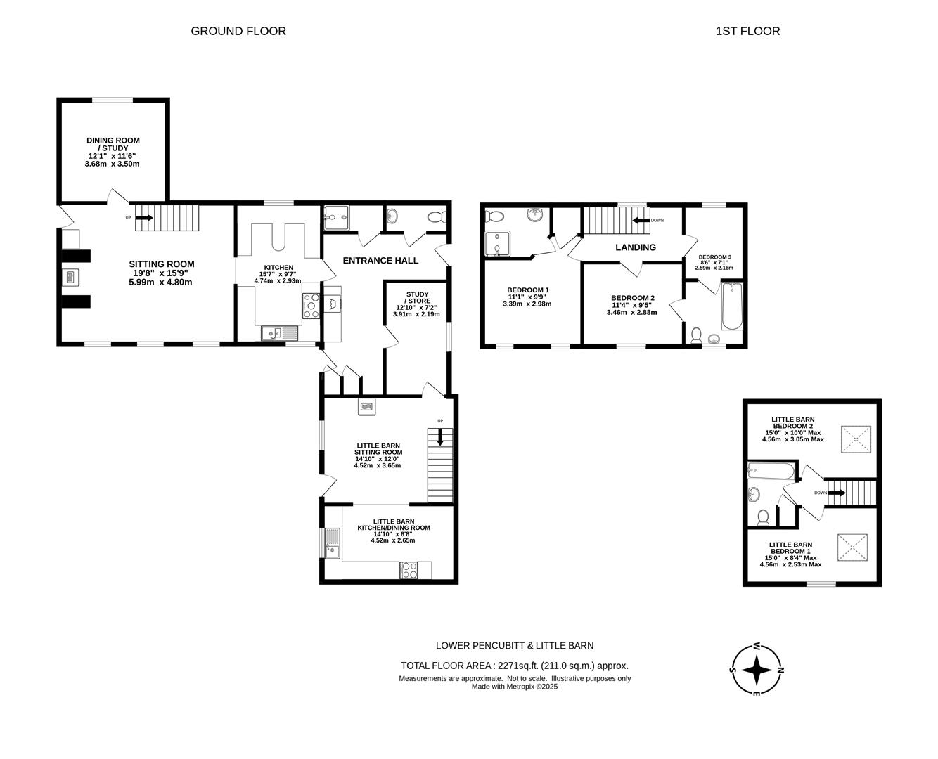 Lower Pencubitt Barn is very well presented with character and modern contemporary features including slate flagstone and tiled floors, beamed ceilings, large fireplace, double glazed windows and oil fired central heating. The accommodation comprises:- Entrance Hall; ‘L’ shaped with beamed ceiling, slate flagstone floor, fitted wall and base units, space and plumbing for washing machine, and door leading to rear garden. Study / Cloakroom and Store; interconnecting door to Little Barn, beamed ceiling, window to the front. Cloakroom; vanity unit, bespoke wash basin, w/c and heated towel rail. Former Shower room / Store. Kitchen / Breakfast Room; a dual aspect room with windows to the front and rear, fitted wall and base units under black granite worksurfaces, matching breakfast bar, Stoves Richmond Deluxe range cooker with five ring induction hob, integrated Neff dishwasher, tiled floor,. Sitting / Dining Room; large cut stone and granite fireplace, Wood Warm woodburning stove, three windows overlooking the rear garden and door to the side. Staircase to the first floor. Dining Room / Study; beamed ceiling, window to the front. On the First Floor; Landing; window to the front overlooking the garden. Bedroom 1; exposed ceiling beams window to the rear garden, built in storage cupboard. En suite; shower enclosure, w/c, wash basin, heated towel rail. Bedroom 2; window the rear garden, door to the Jack & Jill bathroom. Bedroom 3 / Dressing Room with window to the front and door to the Jack & Jill bathroom; w/c, wash basin, bath with shower over, heated towel rail.