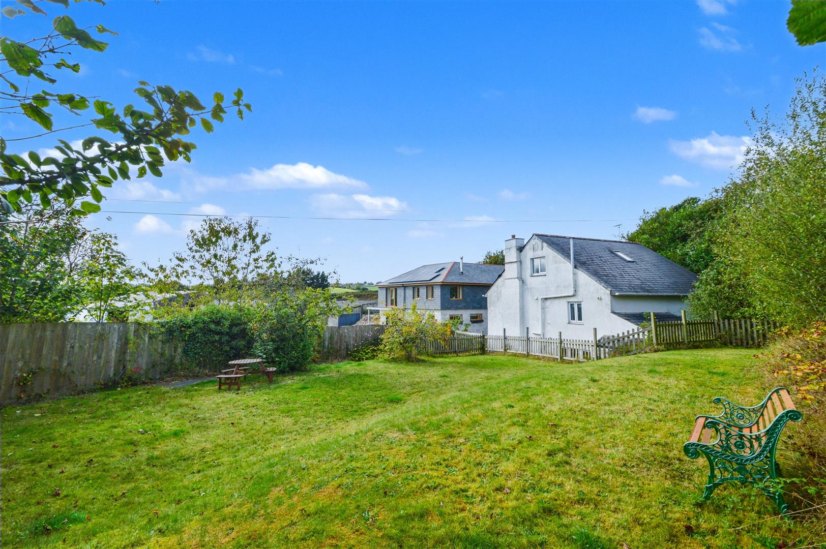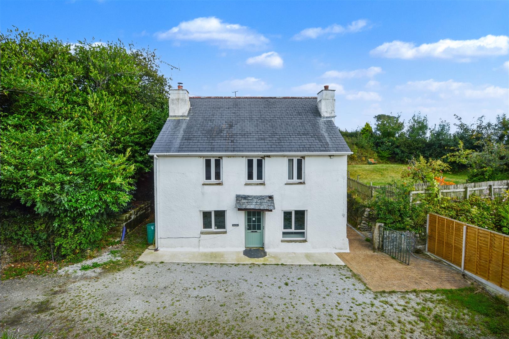 At the front of the house is a parking area, a path leads around to the rear of the garden and the lawned terrace and flowerbed borders interspersed with fruit trees and enclosed within wooden fencing and treelined Cornish bank hedging.