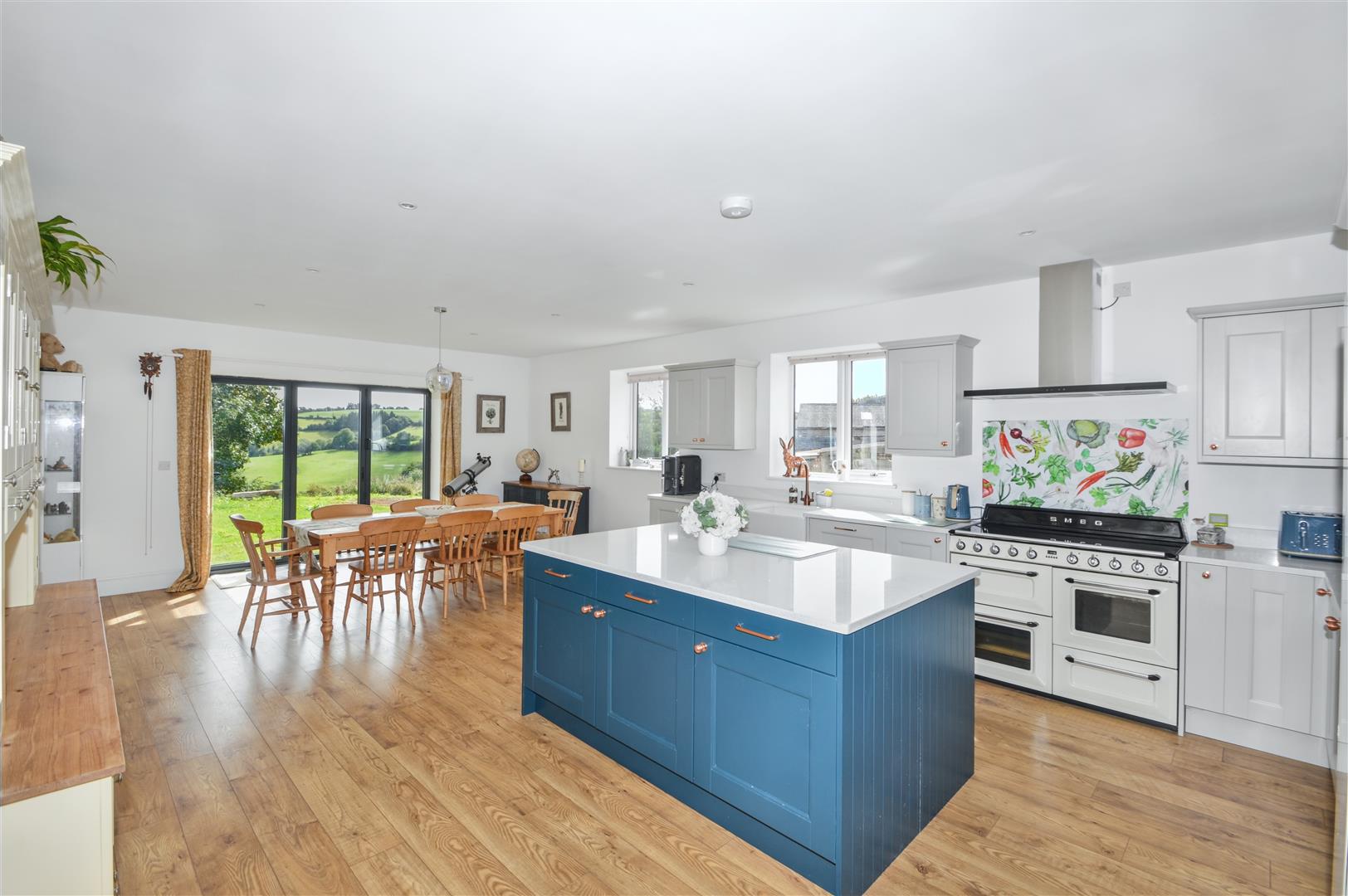 Damson Barn is a 5 bedroom bespoke design barn conversion, internally finished to a high standard, benefiting from oil fired central heating, underfloor heating to the ground floor, radiators to the first, double glazed windows and doors. The accommodation briefly comprises: Entrance Hall; chestnut laminate flooring, steps to the lower ground floor and stairs to the first floor. Utility / Boot Room; tiled floor, base units under beech block effect worksurface, inset stainless steel sink and drainer, space and plumbing for a washing machine and tumble dryer. Cloakroom; tiled floor, wash basin and w/c. Study; chestnut laminate flooring, window to the side. Kitchen / Dining room; fitted wall and base units under quartz worksurfaces, Smeg electric range cooker with induction hob, extractor hood above, built in dishwasher, central island with cupboard and drawers under a quartz worksurface. Bi-fold powder coated double glazed doors open to the rear garden. Panty; fitted shelves Sitting Room; a dual aspect room, windows to the side and rear, enjoying views over the land and surrounding countryside, chestnut laminate flooring, woodburning stove on a polished black granite hearth.