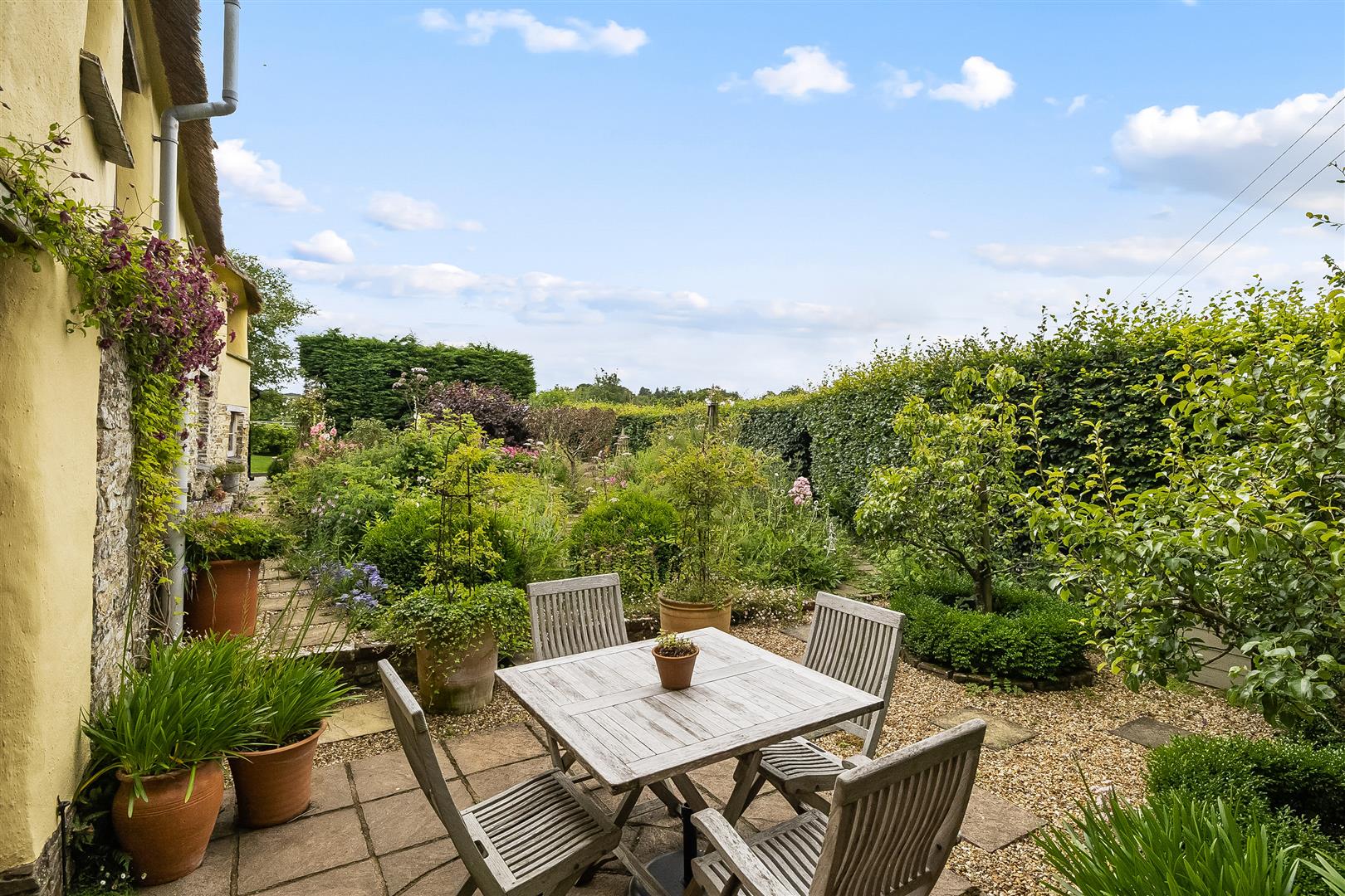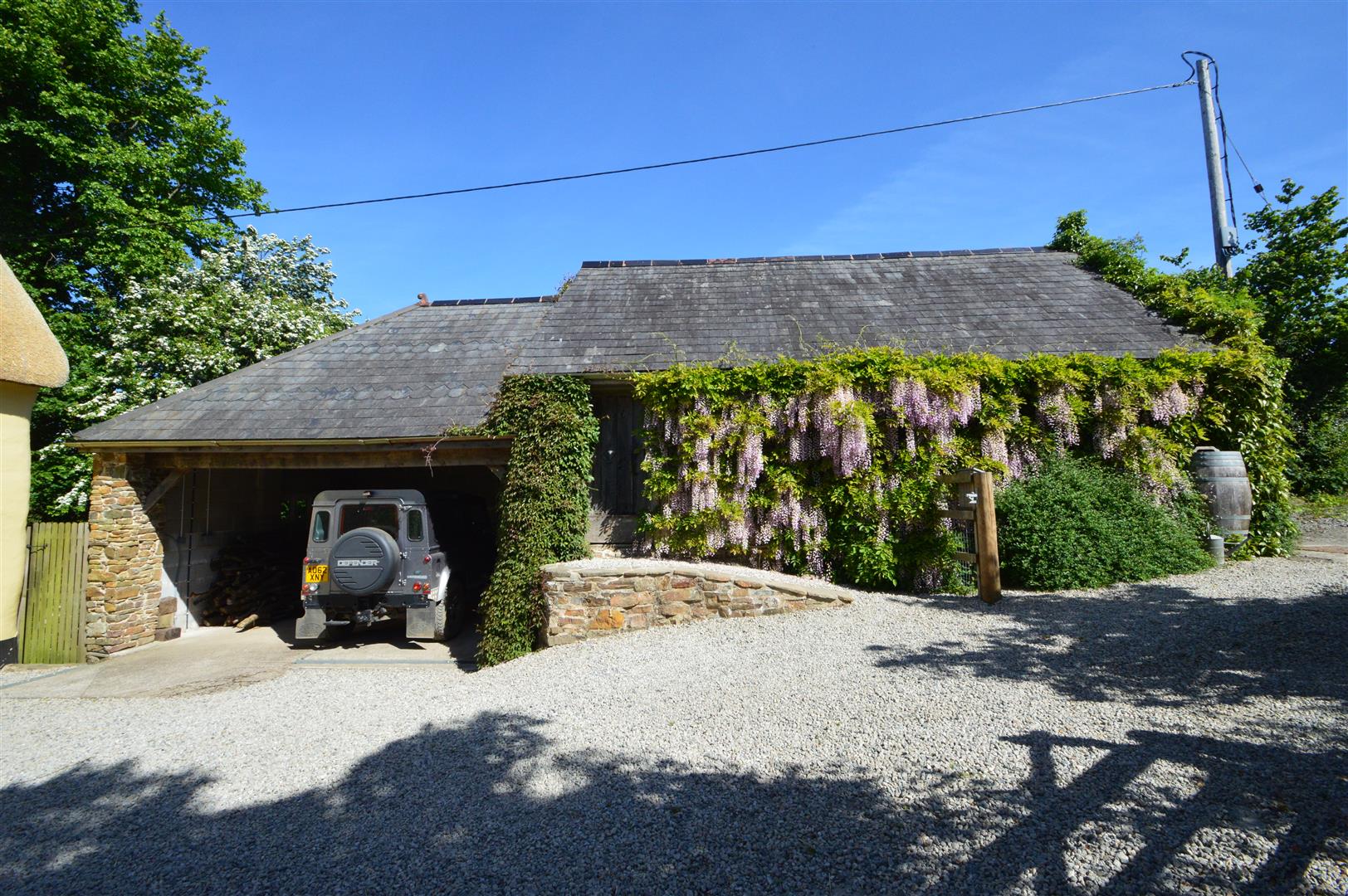 The property is accessed over a shared entrance lane, the house is found at the end of the lane and a gated entrance opens to a gravelled parking area at the front of the house, car port and barn. The gardens are arranged adjoining the parking area at the front, side and rear of the house. At the front is an enclosed lawn garden interspersed with a variety of flowering shrubs, trees and flowerbeds and well with stone surround top. The lawn leads around to the side of the house with steps onto the gravel patio at the side of the conservatory, which is ideal for alfresco dining and entertaining. A gravel path leads to the rear, cottage garden which gives a massive show and sea of colour during the spring and summer with 18 varieties of rose and over 30 clematis. A paved patio where the French Doors open from the sitting room, bordered by a small orchard of fruit trees. The path continues through an arch opening, Beech hedge with secluded seating area and