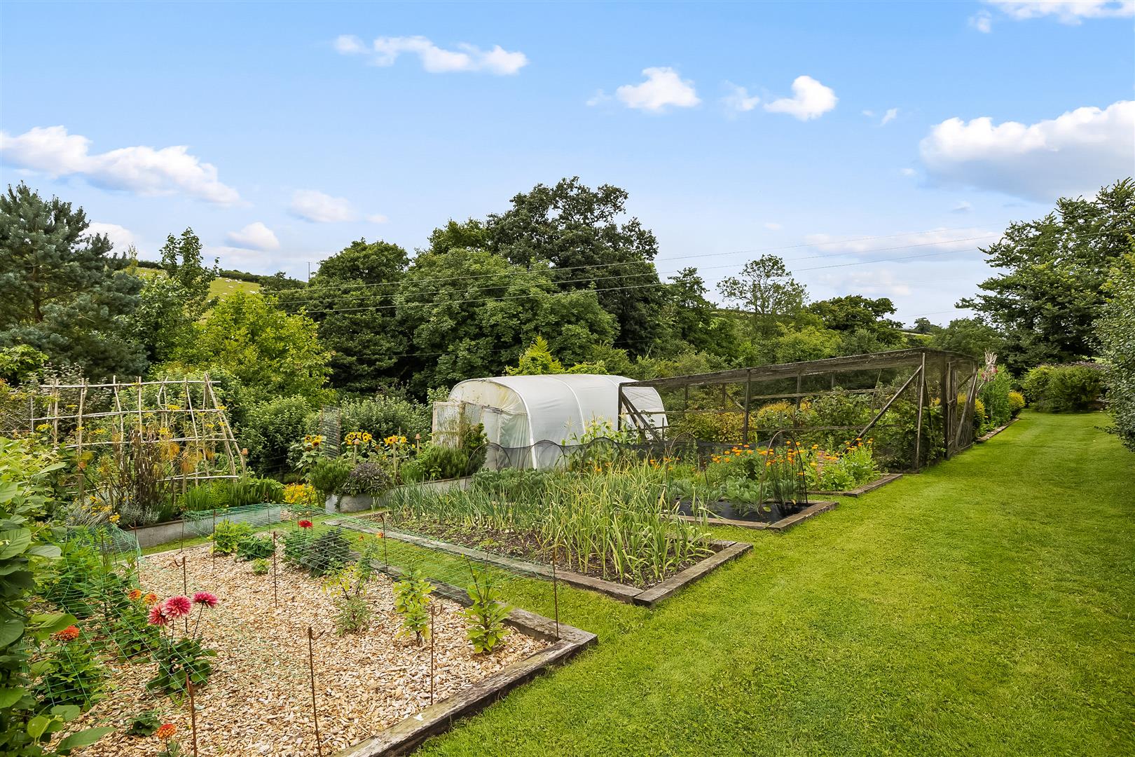 A lawned area surrounds raised vegetable beds providing self sufficiency and fruit cages with strawberries, raspberries, blackcurrants, redcurrants, tayberries and blueberries and a Polytunnel: 5.15m x 3.50m (16'10" x 11'5") Below the polytunnel is an apple tree orchard and poultry enclosure with a wooden Shepards hut style chicken house. Steps lead to; the valley garden planted with a variety of specimen shrubs and trees leading to, stream running through the valley and a small area of amenity woodland on the opposite bank.