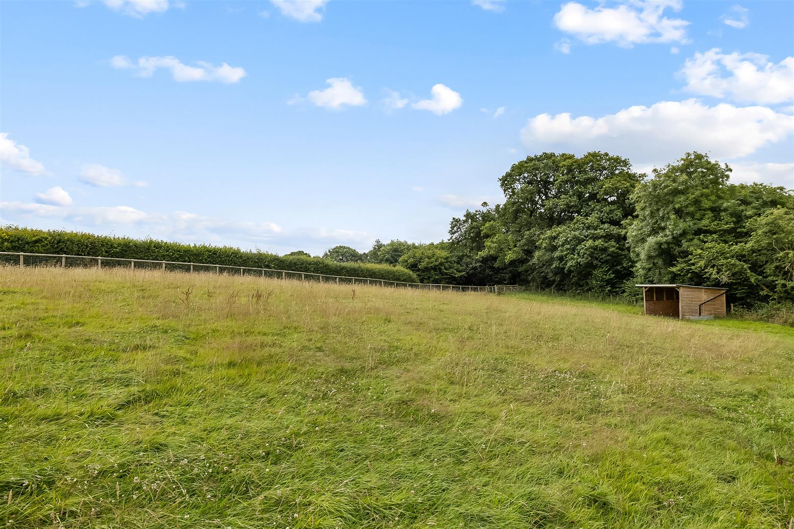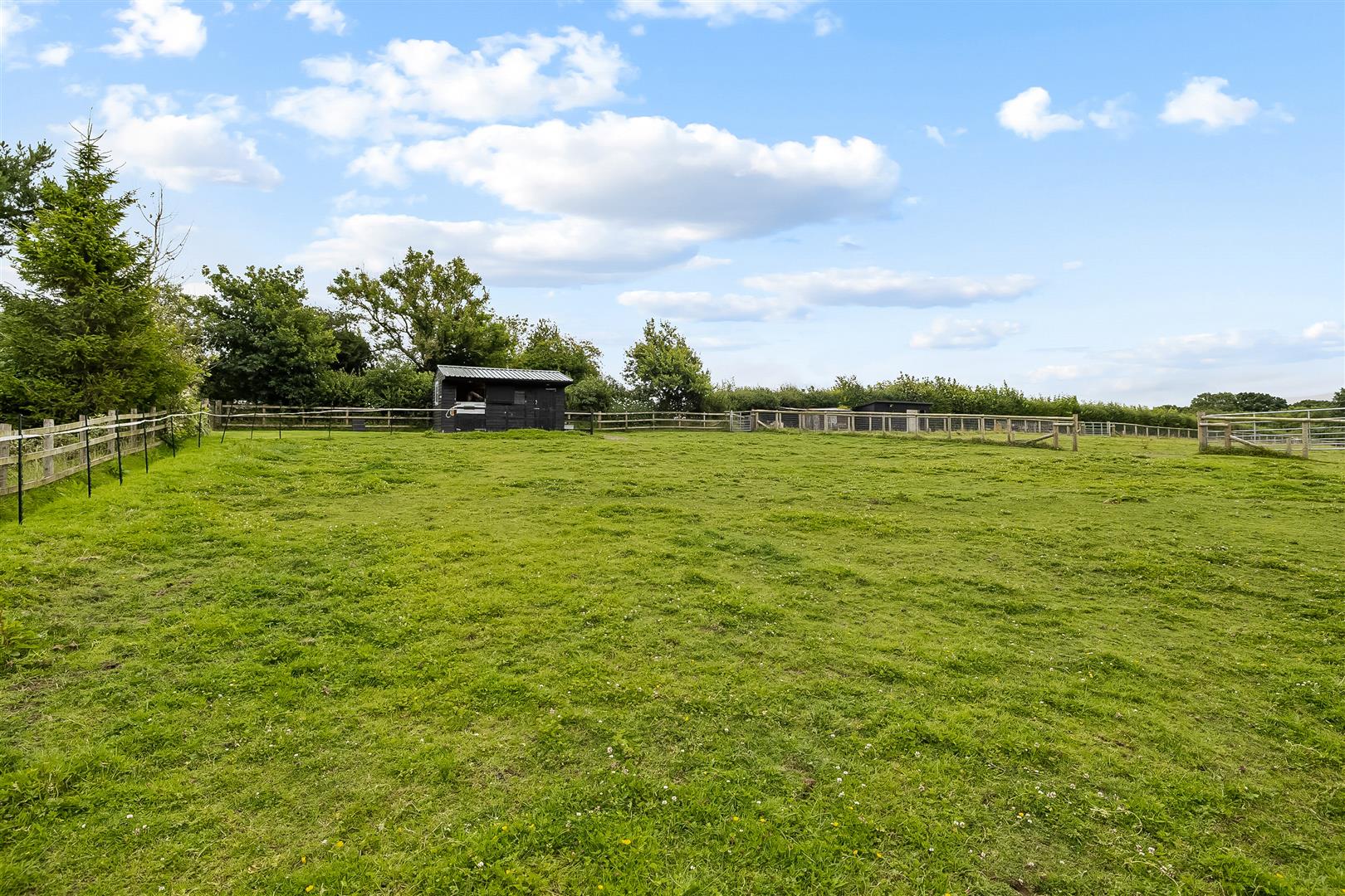The level paddocks extend to approximately 2.43 acres enclosed within treelined hedging and horse netting. In the far paddock is a Field Shelter: 3.53m x 3.63m (11'6" x 11'10")