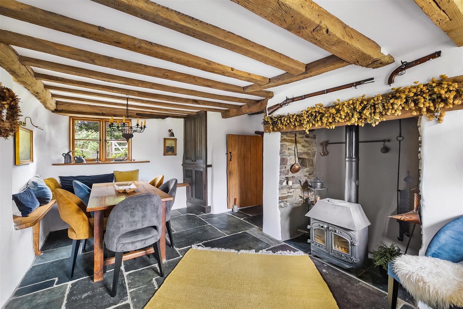 The house is a most appealing and characterful thatched 3 bedroom Grade II listed house which dates back to 1842. The charming and most appealing accommodation has many of its original features including, Oak lintels over the windows and doors, beamed ceilings, slate flagstone floors in the reception rooms and inglenook open fireplaces. In recent years the property has been updated with oak windows and doors, oak window sills, tiled floors in the utility and kitchen. A particular feature of the house is the triple aspect Oak Conservatory with full length bifold doors opening on the patio and garden. The accommodation benefits from double glazed windows and oil fired central heating, underfloor heating on the ground floor, on the first floor wooden floors and radiators. The accommodation briefly comprises; Front entrance hall, Kitchen / Breakfast Room, bespoke solid Oak kitchen units, granite worksurfaces and ceramic sink, inset faux inglenook housing the solid fuel Rayburn with a back boiler. Conservatory; Solid Oak triple aspect, full length bi-fold doors open to the patio and garden. Dining Room; a dual aspect room, inglenook fireplace, wood burner and bread oven, beam ceiling. Sitting Room; a dual aspect room with windows to the front and window and French doors to the rear, inglenook fireplace, multi fuel burning stove. On the First Floor; Large Landing, windows to the rear. Bedroom 2; Dual aspect with windows to front and rear, inset low level fireplace (dis-used), vaulted ceiling with exposed ‘A’ frames. Family Bathroom; Freestanding double ended bath, vanity unit, round bowl sink, w/c, large shower enclosure with rain head shower, window to the front and stained glass window to the landing giving borrowed light. Bedroom 3; Window to the front, built in airing cupboard. Master Bedroom; Vaulted ceiling with exposed ‘A’ frame beams, dual aspect with windows to the rear and side, fitted wardrobes and eaves storage area. En suite Bathroom; Freestanding slipper bath, round wash basin and w/c.